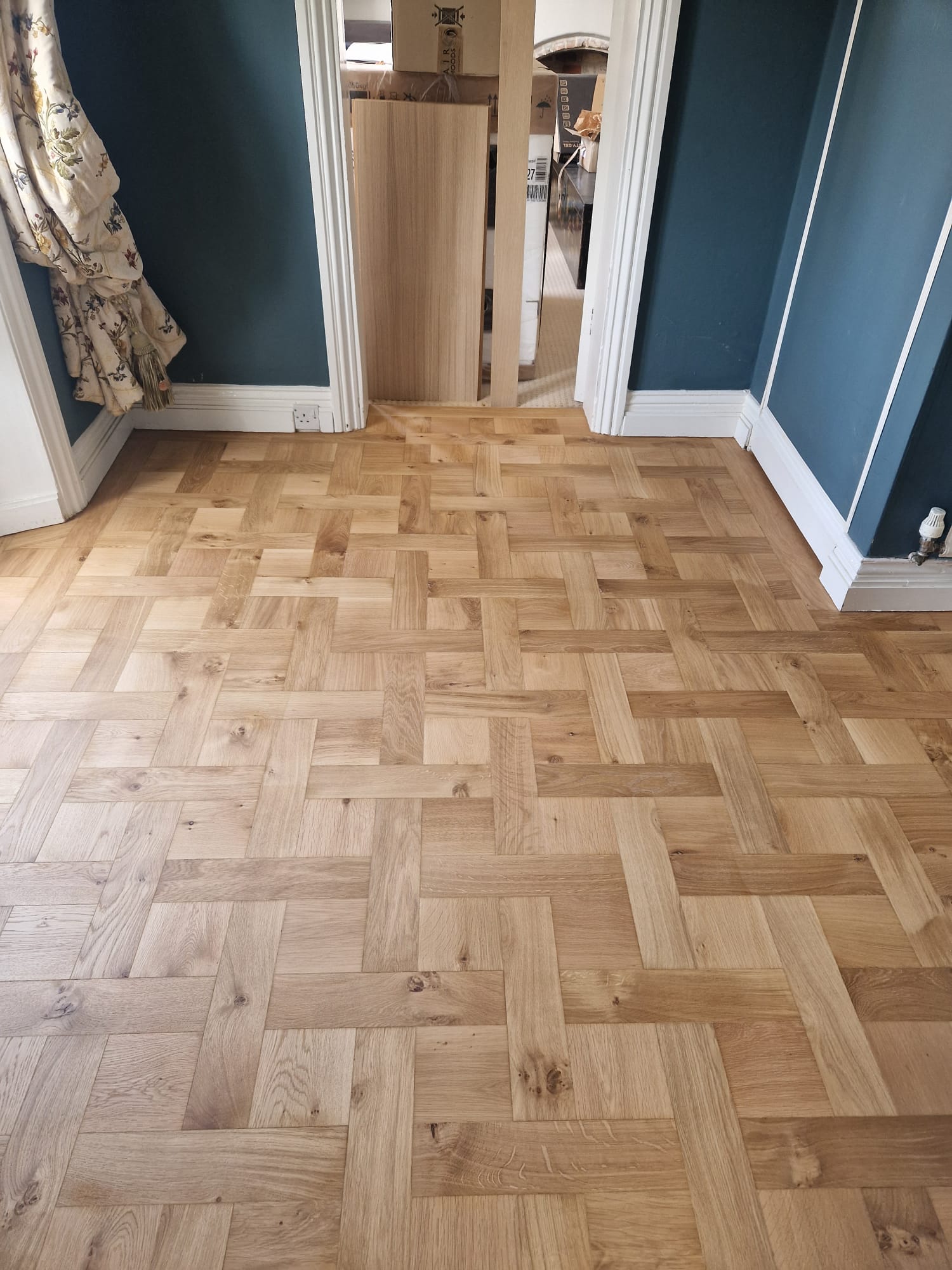 In Wimborne, we were asked to restore a continuous Versailles oak parquet wood floor and extend the intricate pattern seamlessly into the kitchen. The wood floor restoration process brought out the elegance and depth of the oak, while the new section blended perfectly with the original flooring to maintain a flawless flow throughout the home. To protect and enhance the parquet, we finished the entire floor with Osmo Clear Matt Hard Wax Oil, giving it a durable yet natural look. The result is a timeless feature that elevates the whole living space.