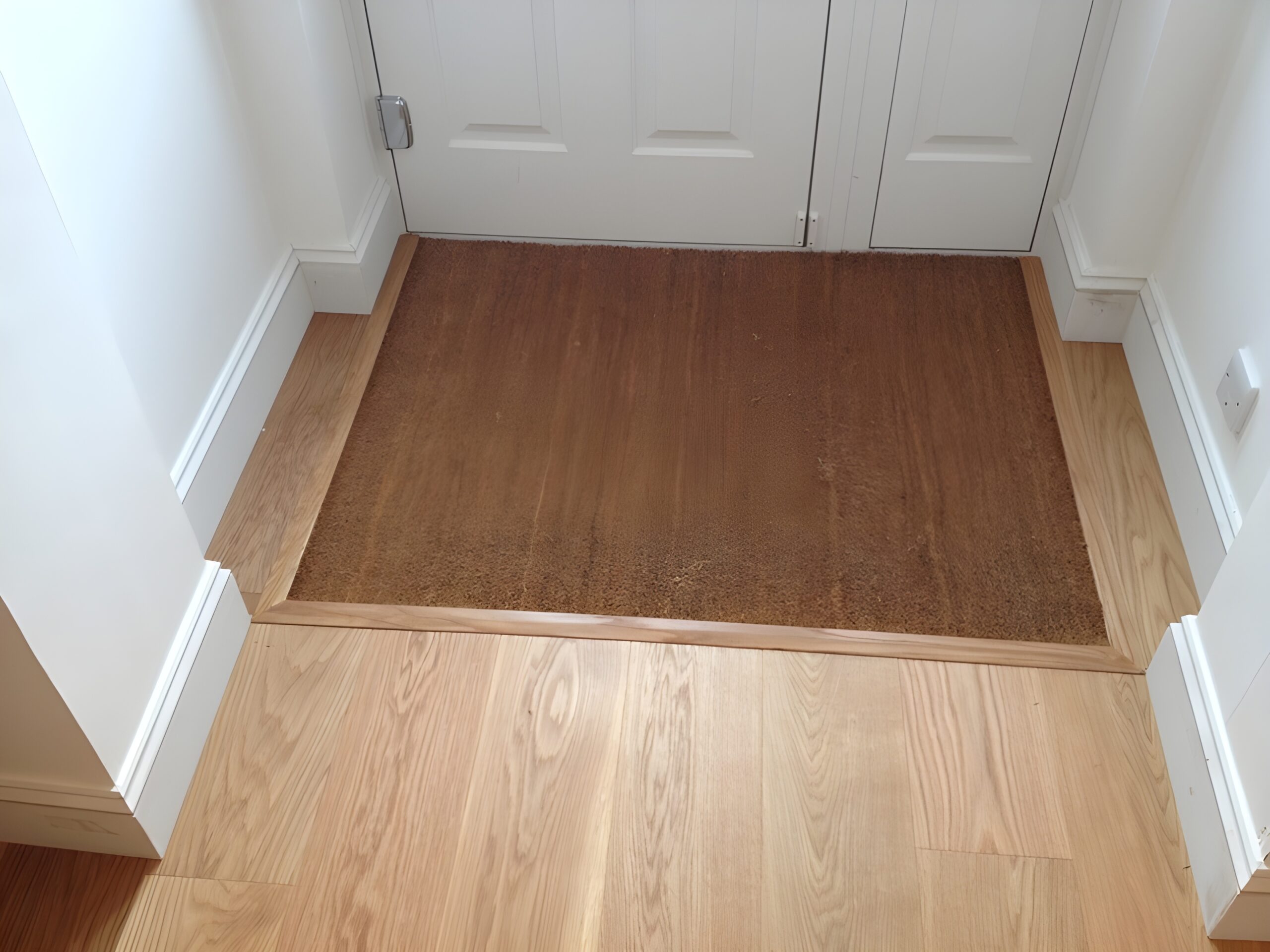 Engineered plank wood flooring installed in Wilton, Salisbury by our highly skilled wood floor supply and fit installation team. Prime oak planks transformed this hall in just one day, we always recommend a insert mat when installing wood flooring in a hallway – they look great and save your wood flooring from dirty boots.